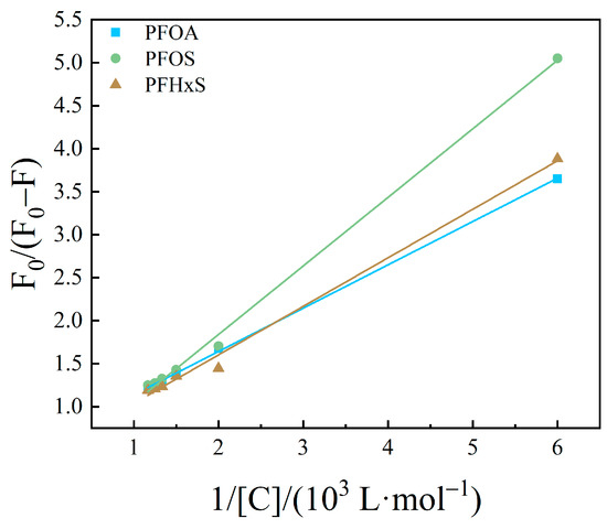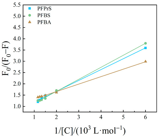 The modified Stern–Volmer curves with the inverse concentration of PFASs as the horizontal coordinate and as the vertical coordinate are shown in Figure 7, Figure 8 and Figure 9. The fitted equations, R2, and fluorescence quenching rate constant Kq were shown in Table 1, Table 2 and Table 3.