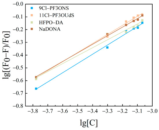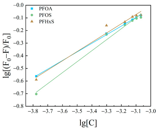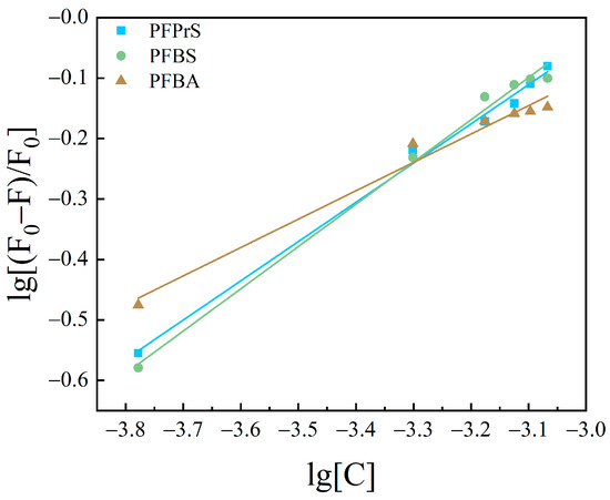 Based upon the results of PFASs binding on HSA as a static quenching process, the binding between the two conforms to the expression formula for the binding of fluorescent substances and quenching agents: Lineweaver–Burk double logarithmic Equation (3) [40]. The binding constants and apparent binding sites were calculated for the system of interaction between PFASs and HSA.