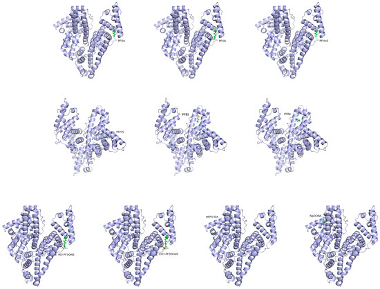 The crystal structure of HSA was taken from the Protein Structure Database (Protein Data Bank) with PDB code 4E99 [35]. The structure of PFASs was drawn using Chemdraw 21.0.0. and optimized for the minimum energy to reach the lowest energy state of the chemical structure [36]. Molecular docking simulations of PFASs binding with HSA were performed using Autodock Vina (v 1.1.2) [37]. A grid box of 126–126–126 with a spacing of 0.581 Å was used in order to include all possible binding sites for each PFAS to HSA. The center grid box of x, y, and z was 0.861, 1.278, and −4.167, respectively. Each simulation generated 10 binding modes and the value of exhaustiveness is 10. Molecular docking results were visualized and analyzed using PyMOL 2.5.2. [38].