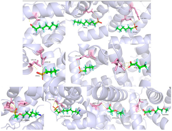 As shown in Figure 13 and Figure 14, green color represented carbon atoms, cyan color represented fluorine atoms, red color represented oxygen atoms, yellow color represented sulfur atoms, blue represented chlorine atoms, pink color represented amino acid residues, and the yellow dashed line represented hydrogen bonds. Negative figures for the binding energy indicated that the bindings of HSA and PFASs were an exothermic reaction that can occur spontaneously. The larger the absolute value of binding energy, the more energy is released during the synthesis of the complex. Accordingly, the more energy is released, the lower the system energy is retained, and the formed complex is hence more stable [52]. As demonstrated in Table 7, the binding energy between long-chain PFASs and HSA is lower than that of short-chain PFASs alternatives. When the carbon chains are the same, the binding energy of PFSAs is lower than that of PFCAs. As the carbon chain increases, the binding energy decreases. For novel PFASs alternatives, the binding energy of PFOA is lower than its alternatives of NaDONA and HFPO–DA. Similarly, the binding energy of PFOS is lower than its alternatives of 9Cl–PF3ONS and 11Cl–PF3OUdS. Furthermore, the binding energy of short-chain PFASs alternatives is lower than that of novel PFASs alternatives. It is revealed that the complexes between three long-chain PFASs and HSA are more stable than their short-chain and novel alternatives.