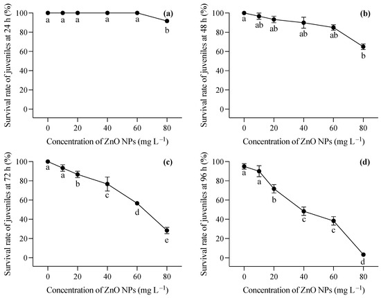 Survival rates at 24 h (a), 48 h (b), 72 h (c), and 96 (d) of T. obscurus juveniles exposed to different concentrations of ZnO NPs. Different letters represent significant differences (p < 0.05) among different ZnO NP concentrations.
