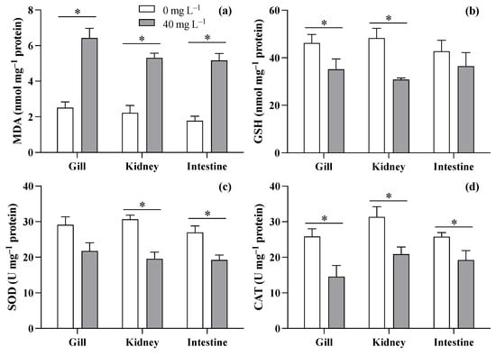 MDA (a), GSH (b), SOD (c), and CAT (d) in three tissues of T. obscurus juveniles exposed to 0 and 40 mg/L of ZnO NPs at 96 h. The asterisks (*) above the black bars denote a significant difference between the two ZnO NP concentrations (p ≤ 0.05).
