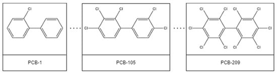 Polychlorinated biphenyls (PCBs) are a class of anthropogenic organic chemicals with a biphenyl structure substituted with one to ten chlorine atoms. Due to the multiple positions of substitution, there are 209 different PCBs, commonly referred to as congeners and numbered based on the amount and position of the chlorines [1]. Some are shown in Figure 1.