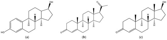 Sex hormones (a) estradiol, (b) progesterone, and (c) testosterone.
