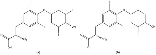 Thyroid hormones (a) thyroxine and (b) triiodothyronine.