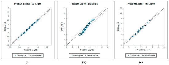 All constructed models reached a favorable goodness-of-fit score of R2 ≥ 0.95, and the ANOVA tests between the training and validation sets all had favorable results (<0.0001). The validation models are shown in Figure 5 and Figure 6, showing the comparison of the actual and predicted values of the training and validation sets for each model.