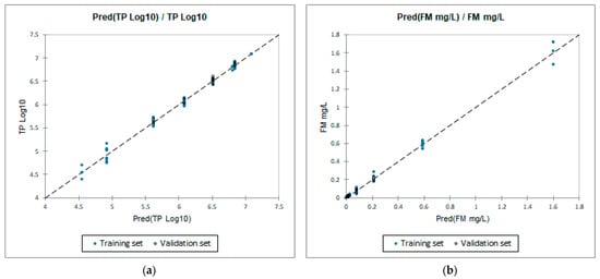 Validation for MNLR models: (a) T. pyriformis IGC50 (48 h) log10 and (b) fathead minnow LC50 (48 h).