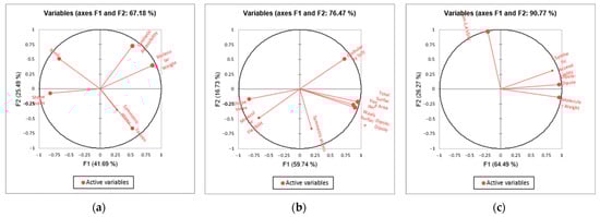 PCA biplots of MLR models: (a) bioconcentration log10, (b) D. magna LC50 (48 h) log10, and (c) fathead minnow LC50 (48 h) log10.