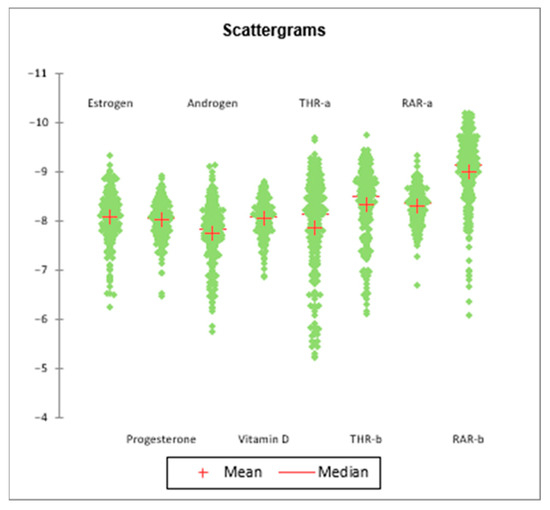 The various methodologies in this study were used to provide focus on the molecular identity and mechanisms of PCBs as EDCs, and to solely consider these molecular factors in their modes of action. To this end, molecular docking simulations of PCBs with various nuclear receptors were run, contrary to other studies which tend to focus on a single receptor or group of receptors. Such a consideration arose from the potential of PCBs to act as hormone analogues, which may not necessarily confine them to the estrogen receptor. The considered receptors include the various sex hormone/steroid receptors (estrogen, progesterone, and androgen), the vitamin D receptor, the thyroid hormone receptor (α and β), and the retinoic acid receptor (α and β). Considering these receptors allowed the study of the various intermolecular bonding forces across all receptor–ligand pairs and therefore the detection of various statistics of interest.