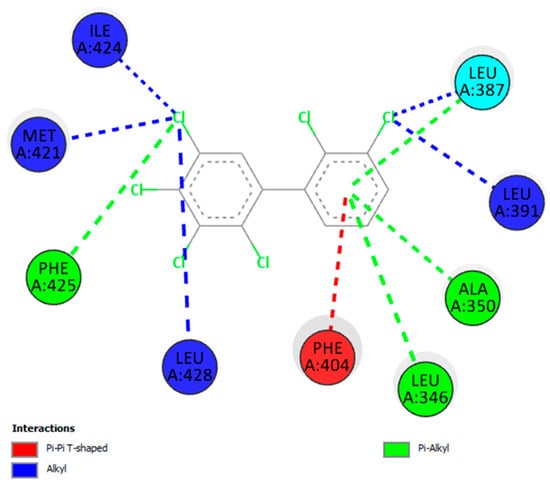 All of the interactions presented in Figure 9 are hydrophobic; this is true for most PCB binding with human nuclear receptors. These hydrophobic interactions may come in the form of pi–pi T-shaped interactions (also known as CH–pi hydrogen interactions), alkyl interactions (between alkyl groups of both ligand and protein), and pi–alkyl interactions (between an alkyl group and a pi–orbital group).