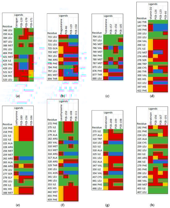The maximum score observed is in retinoic acid receptor β (~−10 kcal/mol), whereas the weakest docking score observed is in thyroid hormone receptor α (~−5.2 kcal/mol). It is also worth noting that the distribution of the docking scores in thyroid hormone receptor α is over a large range (−5.2–−9.7 kcal/mol), whereas the distribution of docking scores in the vitamin D receptor is the most focused (−6.9–−8.8 kcal/mol). Visualizations were extracted from the top PCBs with the strongest docking scores for further analysis, as shown in Figure 9 and in Table 3. While other binding modes were observed, the determined optimal binding mode was taken on the basis of consistency of pose and interacting residues.