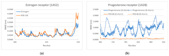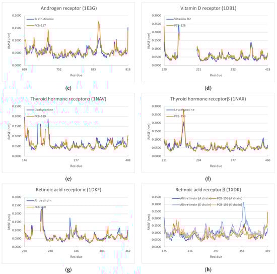 The molecular dynamics simulations were able to shed light on the interaction dynamics of the various receptor–ligand pairs, analyzed during 50 ns for the native ligand and the strongest-binding PCB. One such feature is the root mean square deviation (RMSD), of which the final values (at the end of 50 ns) are shown in Table 4.