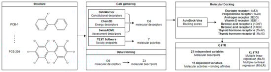 Scheme 1 presents the design of this study. The structures of PCBs (from PCB-1 to PCB-209) were constructed and used to establish a database for PCBs, allowing for the data gathering of various molecular descriptors and activities through the various software listed. This resulted in a total of 136 molecular descriptors and 7 molecular activities. However, most of the molecular descriptors were redundant and/or were identical for the whole dataset, and therefore, pre-processing and trimming of the dataset was necessary, bringing down the number of descriptors to 23. Molecular docking was then conducted to determine the predicted docking scores of each PCB congener to each human nuclear receptor investigated, coupled with molecular dynamics for investigation of these binding events. QSTR was then conducted via multiple linear regression (MLR) and multiple nonlinear regression (MNLR) to determine if there are any correlations between the molecular descriptors with the molecular activities and docking scores.