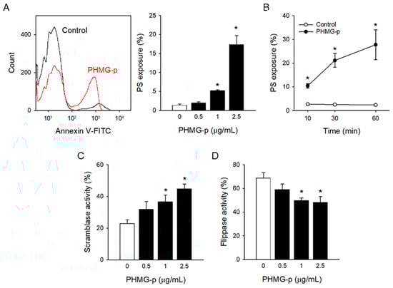 PHMG-p-induced PS exposure in platelets. (A) After platelets were incubated with PHMG-p for 1 h, PS exposure was measured. (B) Time-dependent PS exposure caused by PHMG-p (2.5 μg/mL) is shown. After treatment of PHMG-p for 1 h, (C) scramblase activity and (D) flippase activity were determined. Data are presented as mean ± SEM of 3–5 experiments. * p < 0.05 from control group.