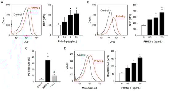Oxidative stress induced by PHMG-p. (A) CM-H2DCF-DA-loaded platelet was incubated with PHMG-p for 1 h, and DCF fluorescence was detected on the flow cytometer. (B) DHE-loaded platelet was incubated with PHMG-p for 1 h and analyzed on the flow cytometer. (C) Platelets were incubated with CAT (1000 U/mL) for 30 min before PHMG-p (2.5 μg/mL) treatment, and PS exposure was determined. (D) MitoSOX-Red-loaded platelet was incubated with PHMG-p for 1 h, and MitoSOX Red fluorescence was detected on the flow cytometer. Data are presented as mean ± SEM of 4–6 experiments. * p < 0.05 from control group. # p < 0.05 from PHMG-p-treated group.