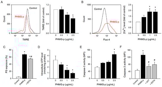 Intracellular mechanism underlying PHMG-p-induced PS exposure. (A) PHMG-p-exposed platelets were incubated with TMRE and analyzed in the flow cytometer. (B) Fluo-4-loaded platelets were treated with PHMG-p for 1 h, and Fluo-4 fluorescence was detected. (C) Platelets were incubated with EGTA (5 mM) for 30 min before PHMG-p (2.5 μg/mL) treatment, and PS exposure was determined. (D) Platelets were incubated with PHMG-p for 1 h, and intracellular ATP level was determined. (E) PHMG-p-exposed platelets were incubated with caspase-3/7 detection reagent and analyzed on the flow cytometer. (F) Platelets were incubated with CAT (1000 U/mL) or EGTA (5 mM) for 30 min before PHMG-p (2.5 μg/mL) treatment, and caspase-3 activity was determined. Data are presented as mean ± SEM of 3–5 experiments. * p < 0.05 from control group. # p < 0.05 from PHMG-p-treated group.