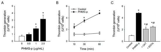 Procoagulant effects of PHMG-p. (A) After platelets were incubated with PHMG-p for 1 h, thrombin generation was measured. (B) Time-dependent thrombin generation caused by PHMG-p (2.5 μg/mL) is shown. (C) Platelets were incubated with CAT (1000 U/mL) or EGTA (5 mM) for 30 min before PHMG-p (2.5 μg/mL) treatment, and thrombin generation was determined. Data are presented as mean ± SEM of 3–5 experiments. * p < 0.05 from control group. # p < 0.05 from PHMG-p-treated group.