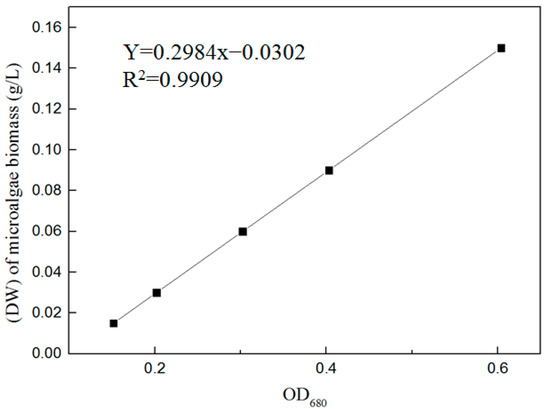 The drying method [25] was used to obtain a linear relationship between the dry weight (DW) of the microalgae biomass and optical density (OD) at a wavelength of 680 nm in the exponential growth phase (Figure 1). The change in microalgae biomass was analyzed by measuring the OD680 at an interval of 2 d using a UV-3900 spectrophotometer (Hitachi High-Tech Science Co., Ltd., Tokyo, Japan). The DW of the microalgae biomass was calculated according to Equation (1).