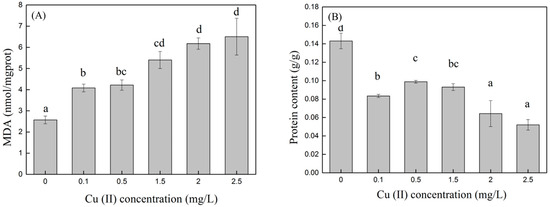 MDA (A) and protein (B) content in algae cells at different Cu (II) concentrations. Different superscripts for each column indicate significant difference (p < 0.05).