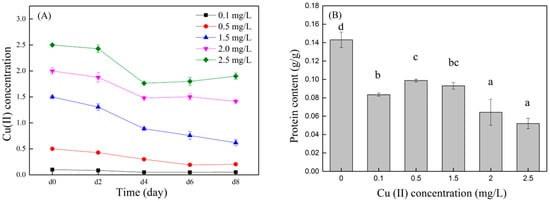 Changes in Cu (II) concentration with culture time (A) and Cu (II) removal efficiency by microalgae (B). Different superscripts for each column indicate significant difference (p < 0.05).