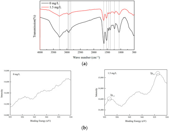 C. vulgaris’s cell walls are mostly composed of polysaccharides, proteins, and lipids, which provide functional groups such as carboxyl, hydroxyl, and amino. These functional groups enable the cell surface to have a negative charge, which shows strong affinity for Cu (II). In the XPS and FTIR analysis, the control (0 mg/L) and the Cu (II) treatment group (1.5 mg/L) with a good microalgae growth status were selected for comparative analysis. The functional groups on the surface of C. vulgaris were the main factors affecting its Cu (II) removal performance. The functional groups of microalgae before and after adding Cu (II) were investigated using FTIR. Figure 6a shows the FTIR spectra of the microalgae dried biomass in the spectral range of 400–4000 cm−1. After adding Cu (II), the band of the characteristic peaks in the infrared spectrum was basically the same as before the addition, but the intensity of the peaks changed. The stretching vibration characteristic peaks of –OH, C–H, and C=O appeared near 3283 cm−1, 2848 cm−1 and 2958 cm−1, and 1641 cm−1, respectively. The characteristic peak near 1533 cm−1 may be attributed to the –NH– group [35]. The absorption peak at 1450 cm−1 is caused by the stretching vibration of C–OH or –CO–NH– [38]. The characteristic peak at 1400 cm−1 was due to the asymmetric stretching vibration of the C–O bond in –COOH. The absorption peaks at 1234 and 1072 cm−1 may be attributed to the stretching vibration of the polysaccharide C–O [39]. After adding Cu (II), the characteristic peaks of –OH, C=O, –COOH, and C–O were significantly weakened. It can be seen that –OH, C=O, –COOH, and C–O play a significant role in the removal of Cu (II) by Chlorella vulgaris, which is similar to the results reported by Gupta and Rastogi [40].