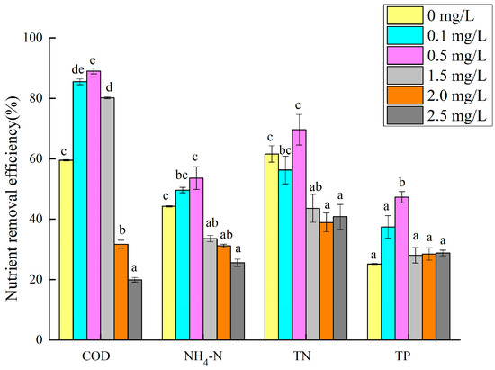 Nutrient removal rate of microalgae cultured in wastewater with different Cu (II) concentrations. Different superscripts for each nutrient indicate significant difference (p < 0.05).