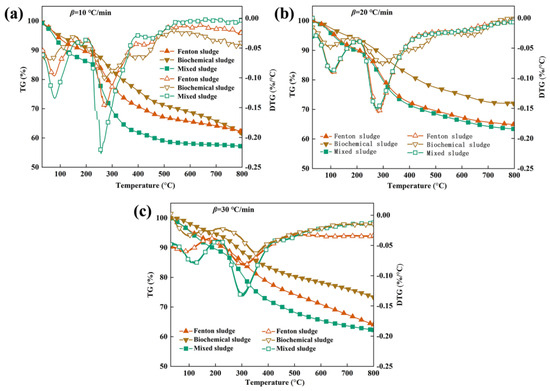 | Types of Sludge | Heating Rates (°C/min) | Maximum Weight Loss (%) | Temperatures at Maximum Weight Loss Rates (°C) | Maximum Weight Loss Rates (%/°C) |