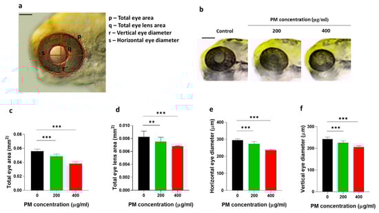 Figure 2. Particulate matter (PM) induced eye toxicity in zebrafish embryos. Zebrafish embryos aged 6~7 h post fertilization (hpf) were incubated with 200 and 400 µg/mL of PM. (a) The anatomical parameters of the eye were measured at 72 hpf. (b) Representative images of reduced overall eye size in the embryos that were incubated with the indicated concentrations of PM. (c) The total eye area, (d) total eye lens area, (e) horizontal eye diameter, and (f) vertical eye diameter decreased in the embryos that were incubated with the indicated concentrations of PM. Data represent the mean ± SD. SD: standard deviation, scale bar: 1 mm, ** p < 0.01, *** p < 0.001.