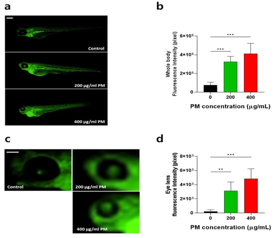 Figure 3. Particulate matter (PM) induced whole-body and eye reactive oxygen species (ROS) generation in zebrafish embryos. Zebrafish embryos aged 6~7 h post fertilization (hpf) were incubated with the indicated concentrations of PM. The whole-body and eye ROS were significantly increased. (a,c) Representative images and (b,d) quantitative analysis of ROS generation from the images. Data represent the mean ± SD. SD: standard deviation, ** p < 0.01, *** p < 0.001. Scale bar: 1 mm.