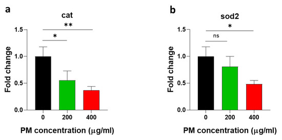Figure 4. Particulate-matter (PM)-induced alterations in antioxidant enzyme mRNA expression. Zebrafish embryos aged 6~7 h post fertilization (hpf) were incubated with the indicated concentrations of PM. The mRNA expression of (a) catalase (cat) and (b) superoxide dismutase 2 (sod2) were reduced through treatment with PM. Data represent the mean ± SD. SD: standard deviation, ns: not significant, * p < 0.05, ** p < 0.01.