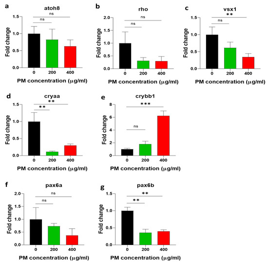 Figure 5. Particulate-matter (PM)-induced mRNA expression alterations in (ac) photoreceptor cell development and pigmentation, (d,e) eye lens development, and (f,g) eye embryogenesis in zebrafish embryos. Zebrafish embryos aged 6~7 h post fertilization (hpf) were incubated with the indicated concentrations of PM. atoh8: atonal bHLH transcription factor 8, rho: rhodopsin, vsx1: visual system homeobox, cryaa: crystallin alpha A, crybb1: crystallin beta B1, pax6a: paired box 6a, pax6b: paired box 6b. Data represent the mean ± SD. SD: standard deviation, ns: not significant, ** p < 0.01, *** p < 0.001.