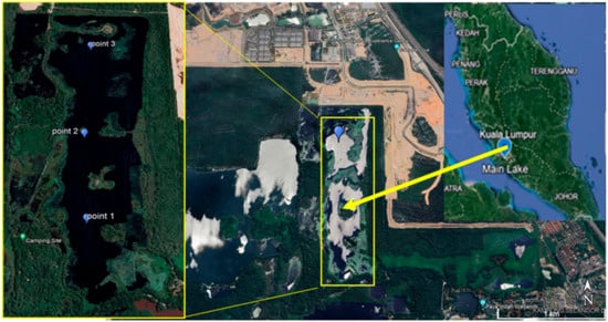 Main Lake is located in the Paya Indah Wetland, Selangor Darul Ehsan, Malaysia as shown in Figure 1. It is a former mining lake, located in preserved land areas, and is a habitat for wildlife such as crocodiles and hippopotamuses. The Main Lake reservoir has a maximum length of 1.7 km, a maximum width of 500 m, and an average depth of 10 m. Three points were chosen to investigate the whole lake area’s water quality. Duplicate water samples were collected at each of the sampling points in the month of March 2022.
