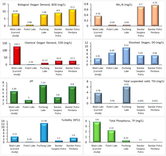 Comparison of some of physico-chemical parameters of ex-mining lake located in Selangor, Malaysia (n.r: data not reported) (Yellow bar: Biological oxygen demand, BOD; Light orange bar: Ammonia nitrogen, NH3–N; Red bar: Chemical oxygen demand, COD; Light blue bar: Dissolved oxygen, DO; Dark green bar: pH; Grey bar: Total suspended solid, TSS; Blue bar: Turbidity; Light green: Total phosphorus, TP).