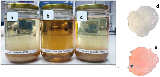 Batch bioreactor dye-eating fungus (BioDeF) after 48 h in (a) 50% lake water sample with 10% (v/v) fungi; (b) 100% lake water without fungi; and (c) 100% lake water sample with 10% (v/v) fungi. Under a dissecting microscope, images are shown of the biomass of Ganoderma lucidum (d) before treatment and (e) after treatment.