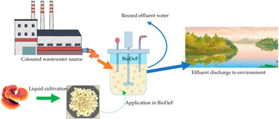 Figure 4 shows the proposed design of BioDeF in real applications of colour removal such as in textile industries and environmental water. The fungal bioreactor can be achieved by either dispersion or immobilisation of the biomass []. Applying pellets formed by self-immobilisation (in liquid cultivation) in BioDeF is a prominent strategy, as numerous difficulties associated with using dispersed biomasses such as insufficient mixing, clogging, difficult separation after treatment, and adhesion to reactor parts may be avoided [,]. Fungus treatment can be used in a continuous mode of treatment [], thus making it viable to apply it on an industrial scale as a biosorption agent as an alternative to expensive materials like activated carbon.