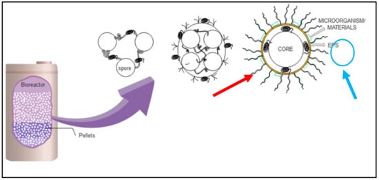 Bioreactor in wastewater or water treatment (red—materials adsorb on pellet; blue—secretion of enzyme exopolysaccharide, EPS) [].