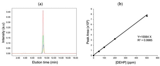 The objective of this study was to provide a standard experimental method to determine the amount of DEHP that migrated from the PVC products. Therefore, first, a calibration curve was prepared by plotting the peak area determined from the chromatogram vs. the DEHP concentration in the range of 0–500 ppm (Figure 1). Next, linear regression was performed and the correlation coefficient was determined to be 0.9985, thus suggesting a strong relationship between the peak area and DEHP concentration obtained from the HPLC analysis.
