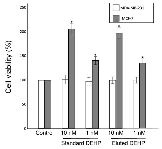 Given that phthalate plasticizers bind to estrogen receptors and mimic estrogen action, the presence of this type of endocrine disruptor can be confirmed in estrogen-dependent and estrogen-independent cancer cell lines [9,26]. Note that MCF-7 cells are estrogen-dependent, whereas MDA-MB-231 cells are estrogen-independent [26]. In brief, the PVC products were immersed in 90% ethanol for 24 h, and an eluted plasticizer was used to test the viability of the MCF-7 and MDA-MB-231 cells. Evidently, treatment with standard DEHP or plasticizer eluted from book cover rolls did not affect the viability of estrogen-independent MDA-MB-231 cells. However, standard DEHP and the eluted plasticizer increased the proliferation of estrogen-dependent MCF-7 cells in a dose-dependent manner (Figure 2). The number of MCF-7 cells treated with the eluted DEHP was increased by 1.3 and 1.9 times for concentrations of 1 nM and 10 nM, respectively, compared to the control group.