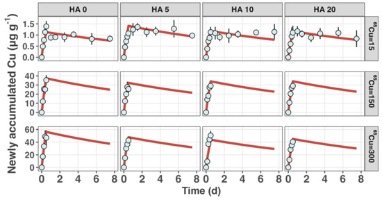 The uptake rate constants represent values measured at nominal 65Cu concentrations of 15, 150, and 300 μg L−1, with each level corresponding to varied concentrations of humic acid (HA). A consistent value for the elimination rate constant was applied across varying levels of HA and 65Cu concentrations; was estimated to be 0.0582 ± 0.0139 d−1. Presented values are means ± standard deviation.