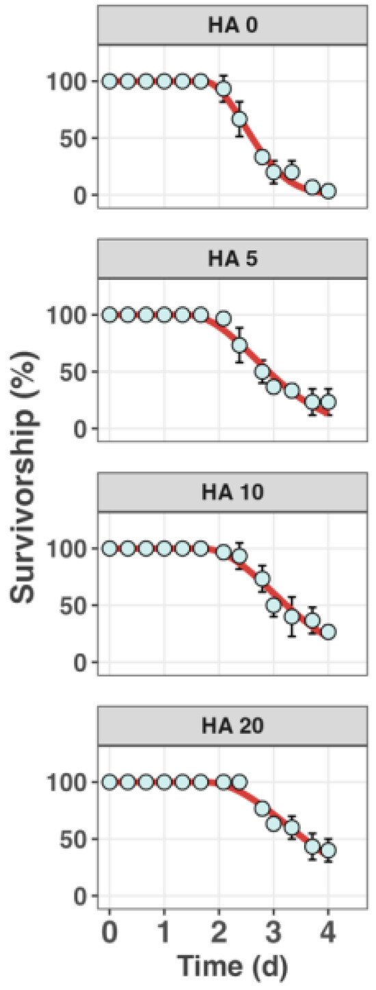 Survivorship of the razor clam S. constricta when exposed to 300 µg L−1 65Cu across a gradient of humic acid (HA) (nominal concentrations are 0, 5, 10, and 20 mg L−1) for 96 h. Data points represent the mean observed survival percentages with error bars indicating standard deviation (n = 3). The lines represent the best fits from the model.