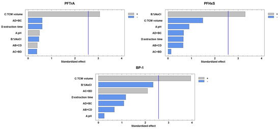 Pareto diagrams showing the significance of standardized effects of DLLME conditions on peak areas for PFTrA, PFHxS, and BP-1.