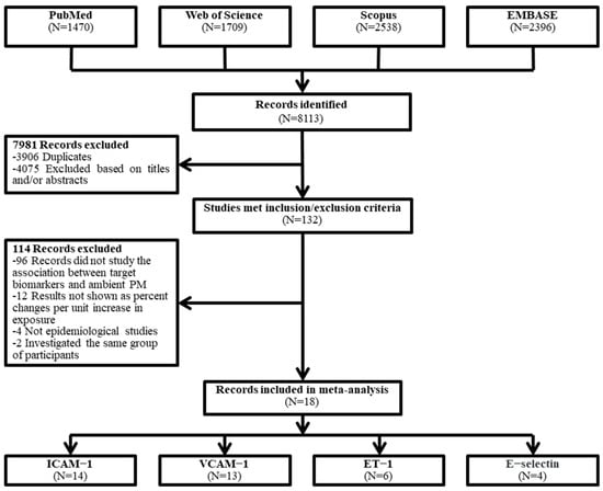 To search for articles, we performed a comprehensive search using relevant keywords of exposure and outcomes in the following databases: PubMed (all fields), EMBASE (all fields), Scopus (article title, abstract and keywords) and Web of Science (topic) up to 20 May 2023. The terms related to ambient PM and “ICAM-1”, “VCAM-1”, “ET-1”, and “E-selectin” and their synonyms were used in searches. The detailed retrieval strategies for this meta-analysis are provided in the Supplementary Materials, Table S1.