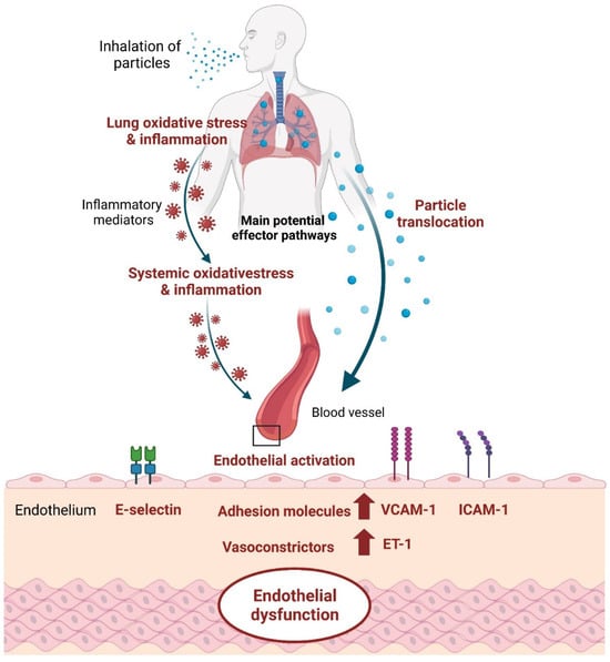 Indeed, endothelial dysfunction is strongly associated with almost all classical risk factors and is a key initiating event in the pathophysiological mechanisms of air pollution-mediated cardiovascular disease [,]. Previous studies have consistently shown that endothelial dysfunction is associated with atherosclerosis, atherosclerotic plaque rupture and thrombosis []. Several main pathophysiological insights into the mechanisms of PM2.5-mediated endothelial dysfunction and cardiovascular diseases have been proposed (Figure 3) []. The classical pathway was that inhaled PM activates pulmonary inflammation and generates reactive oxygen species, which release inflammatory mediators that further enter the circulation, induce dysfunction in distal tissues as blood vessels, and trigger cardiovascular events [,] (Figure 3). Systemic inflammation and oxidative stress may lead to the activation of endothelial cells, increased vascular permeability, and impairment of the endothelial vasomotor and vascular reparation function. It directly induces vascular injury and endothelial dysfunction, which involves increased systemic vasoconstrictors, including ET-1, tumor necrosis factor α, C-reactive protein, prostaglandin E2, and interleukin 1β, elevated pro-inflammatory factors and adhesion molecules such as interleukin 6, monocyte chemoattractant protein 1, E-selectin, VCAM-1, ICAM-1, soluble vascular cellular adhesion molecule 1 and soluble intercellular adhesion molecule 1sICAM-1, and pro-thrombosis, involving the von Willebrand factor and tissue factor [,]. Another proposed but controversial mechanism is that particulate constituents may also reach the systemic circulation via direct transfer from the lung (Figure 3) [,,]. Nanoparticles in the circulation may interact with the vascular endothelium and directly trigger pro-inflammatory changes and oxidative stress in the vasculature and cardiac muscle [,]. Both mechanisms may lead to endothelial damage or endothelial dysfunction, which plays a key role in the development of atherosclerosis and acute myocardial ischemia [,].