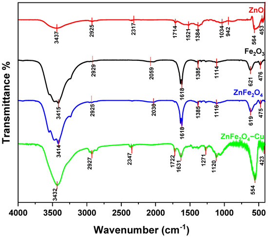 The formation of nanomaterials and metal–oxygen bond formation was further confirmed by functional group analysis, FT-IR spectroscopy. The FT-IR spectra shown in Figure 3 were recorded for the prepared samples in the range of 4000 and 400 cm−1, and the vibrational signals were analyzed. A broad band at 3100–3700 cm−1 can be returned to the stretching and bending vibrations of the hydroxyl groups or the surface-adsorbed water molecules [66]. The sharp absorption band at around 1618 and 1385 cm−1 could assigned to C=O stretching frequency and bending vibrations of the hydroxide (OH) group of water molecules absorbed at the surface of samples [67]. On the other hand, the peaks at 1114 cm−1 and 2929 cm−1 are attributed to the presence of C–O and C–H vibration modes [68]. These observed peaks are related to different phytochemicals present in the Punica granatum flower extract, which act as reducing and stabilizing agents in the solution to prevent nanoparticle aggregation. These results agree with the previously reported literature [69,70]. Subsequently, the observation of two distinct spectral bands with frequencies of 621 cm−1 and 476 cm−1 was made, which can be ascribed to the vibrational mode of Fe–O within the rhombohedral crystal structure of hematite (Fe2O3), as reported in a previous study [71]. The stretching vibrations of the Zn–O bond in the tetrahedral site of ZnO can be attributed to the two absorption bands observed at 564 cm−1 and 453 cm−1 [72]. The primary source of metal−O stretching is the variations in distances that lead to Fe3+−O2− when the metal ion occupies both octahedral and tetrahedral sites. The Zn–O bond (tetrahedral Zn ion) exhibits a characteristic vibrational peak at 619 cm−1, whereas Fe−O in octahedral configuration exhibits another peak at 475 cm−1. The current findings are supported by the observation of two characteristic bands, one at a lower frequency peak (450 cm−1–400 cm−1) indicating the octahedral sites and one at a higher frequency (600 cm−1–550 cm−1) corresponding to tetrahedral sites [73,74,75]. ZnFe2O4-Cu composite shows bands at 554 cm−1 and 423 cm−1, this shift can be related to the deposition of Cu nanoparticle on ZnFe2O4 [76]. Furthermore, the peak shifts attained due to bending and stretching vibration modes, observed in spectra of ZnFe2O4-Cu further assured the green synthesis of this nanocomposite.