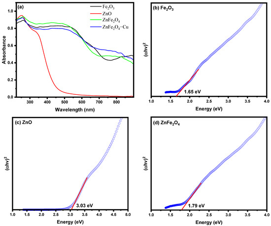 (a) UV-Vis diffuse reflectance spectra of Fe2O3, ZnO, ZnFe2O4, and ZnFe2O4-Cu NPs and (b–e) band gap plots of Fe2O3, ZnO, ZnFe2O4, and ZnFe2O4-Cu NPs.