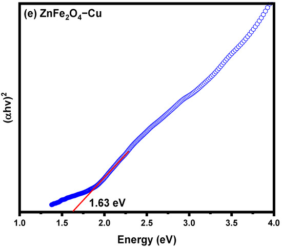 With the purpose of optimizing light irradiation, a semiconductor with high optical absorbance in the visible range is required for good photocatalytic activity [77]. The optical properties of synthesized nanocomposites have been evaluated using UV-Vis DRS. The UV–Vis spectra of Fe2O3, ZnO, ZnFe2O4, and ZnFe2O4-Cu NPs are illustrated in Figure 4a. Because of the narrow band gap of Fe2O3, the pure Fe2O3 particles exhibit high absorption in both the ultraviolet and visible light spectrums. There is an observable light absorption within the wavelength range of 360–555 nm. This absorption is attributed to the electronic transition from the O-2p energy level to the Fe-3d energy level, as shown in references [78,79]. The material ZnO exhibited a broad absorption spectrum ranging from 250 nm to 331 nm. Consistent with expectations, the ZnO nanoparticles exhibited the distinctive spectrum of ZnO, featuring a well-defined fundamental absorption edge that emerged prominently at a wavelength of 331 nm. The UV-Visible spectra of the ZnFe2O4 sample exhibit significant light absorption within the wavelength range of 355–530 nm, as depicted in Figure 4a. This observation indicates that the heterostructure is responsible for the heightened light absorption characteristic within the UV-visible spectrum. The significant augmentation of light absorption has the potential to impact photocatalytic efficacy through the amplification of photo-generated electrons and holes. When Cu nanoparticles were deposited on ZnFe2O4, the absorption intensity in the visible region at around 600 nm undergoes a shift towards higher wavelengths (as shown in Figure 4a). This deposition of Cu nanoparticles onto the ZnFe2O4 heterostructure leads to a significant increase in visible light absorption, particularly at higher wavelengths which can be returned to the charge-transfer transition occurring between the d electrons of the Cu and either the conduction band (CB) or valence band (VB) of ZnFe2O4 [30]. This finding suggests that the presence of Cu effectively enhances the absorption of visible light. The bandgap energy was estimated using the application of the DRS Tauc method, which involves the utilization of the equation (αhν)γ = A (hν − Eg). In this equation, α is the absorption coefficient, h is the Plank’s constant, ν is the frequency of photons, A is a proportionality constant, γ equal to 2 ( direct allowed transitions), and Eg is a band gap energy [80,81]. The bandgap energy is intercepted by extrapolating the horizontal y-axis (photon energy, hv) against the x-axis, as shown in Figure 4b–e. The direct bandgap energy was determined to be 1.65 eV for Fe2O3, 3.03 eV for ZnO, 1.79 eV for ZnFe2O4, and 1.63 eV for ZnFe4O4-Cu by extrapolating (αhv)2 against the photon energy (eV), as shown in Figure 4b–e. The results reveal that the bandgap energy for ZnFe2O4-Cu decreases, which assists the hot electron injection from Cu NPs to the conduction band (CB).
