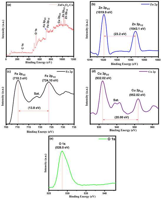 The coordination number and various species present in the ZnFe2O4-Cu nanocomposites analysis using XPS are shown in Figure 5a–e. Figure 5a shows a high-resolution XPS spectrum of the ZnFe2O4-Cu nanocomposites, which exhibit signals of different elements (Zn, Fe, Cu, and O). The occurrence of the C 1s peak at around 285.6 eV can be returned to the presence of carbon and adsorbed CO2 on the surface of the ZnFe2O4-Cu NPs [82]. Figure 5b–e are the narrow scan XPS spectra for 1s-O, 2p-Fe, 2p-Zn, and 2p-Cu elements, respectively. In the high-resolution Zn 2p spectrum, there are two distinct peaks at 1019.9 and 1043.1 eV, representing the binding energies of Zn 2p3/2 and Zn Zn 2p1/2, respectively [83]. The XPS spectrum of Fe 2p exhibited two prominent peaks. The peak at approximately 710.3 eV corresponds to Fe 2p3/2, while the peak at around 724.10 eV corresponds to Fe 2p1/2. These peaks indicate that Fe is predominantly present in a Fe+3 [84,85]. The XPS peaks of Cu 2p revealed two prominent peaks at 932.02 eV and 952.02 eV, which are characteristic of reduced copper Cu0 phase. Furthermore, the satellite peaks around 938.88 and 941.56 eV can be returned to the presence of Cu+2, which can be returned to the incomplete reduction of Cu or may be due to the fact that the Cu can be easily oxidized [86,87]. The peak of O 1s at around 528.5 eV indicates the presence of oxygen in the lattice and oxygen adsorbed on the surface of ZnFe2O4-Cu NPs [88,89,90]. These results are analogous to earlier reports and confirm the formation of ZnFe2O4-Cu nanocomposites.