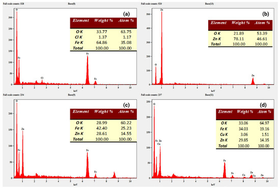 EDX spectra of (a) Fe2O3, (b) ZnO, (c) ZnFe2O4, and (d) ZnFe2O4-Cu NPs.