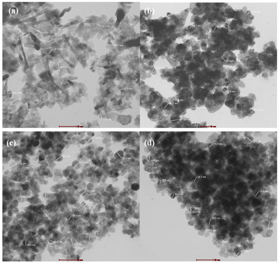 TEM micrographs for Fe2O3, ZnO, ZnFe2O4, And ZnFe2O4-Cu NPs are shown in Figure 8a–d. The TEM image of Fe2O3 NPs clearly exhibits spherical, nearly spherical, and rod-like-shaped nanocrystalline phases with an average particle size equal to 15.5 nm, close to the crystallite size obtained by the XRD result. In the case of ZnO NPs, the TEM image demonstrates nearly spherical and hexagonal particle shapes with an average particle size of 29.7 nm. Almost ZnFe2O4 and ZnFe2O4-Cu exhibited spherical and nearly spherical nanocomposite shapes. Moreover, careful observation of the TEM image of ZnFe2O4-Cu nanocomposites unveiled that Cu NPs were deposited on the surface of ZnFe2O4 in an unsymmetrical manner, where the black spot is Cu NPs while the gray is ZnFe2O4 nanocomposites. This unsymmetrical deposition led to a long aggregation of ZnFe2O4-Cu nanocomposites. The average particle size for both ZnFe2O4 and ZnFe2O4-Cu nanocomposites were 19.1 and 16.8 nm, respectively, which is slightly bigger than the crystallite size obtained by Scherrer’s formula using XRD data. These results confirm that the ZnFe2O4 nanocomposites retained their morphology, particularly the high specific surface area. Furthermore, when the samples were calcined at 350 °C for 3 h, the small ZnFe2O4-Cu nanocomposite particles gradually grew and became more crystalline. This result is also in agreement with that obtained by SEM and BET analyses.