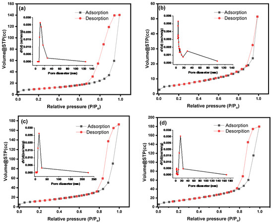 BET adsorption–desorption isotherm of (a) Fe2O3, (b) ZnO, (c) ZnFe2O4, and (d) ZnFe2O4-Cu NPs (inset DFT pore size distribution pattern).